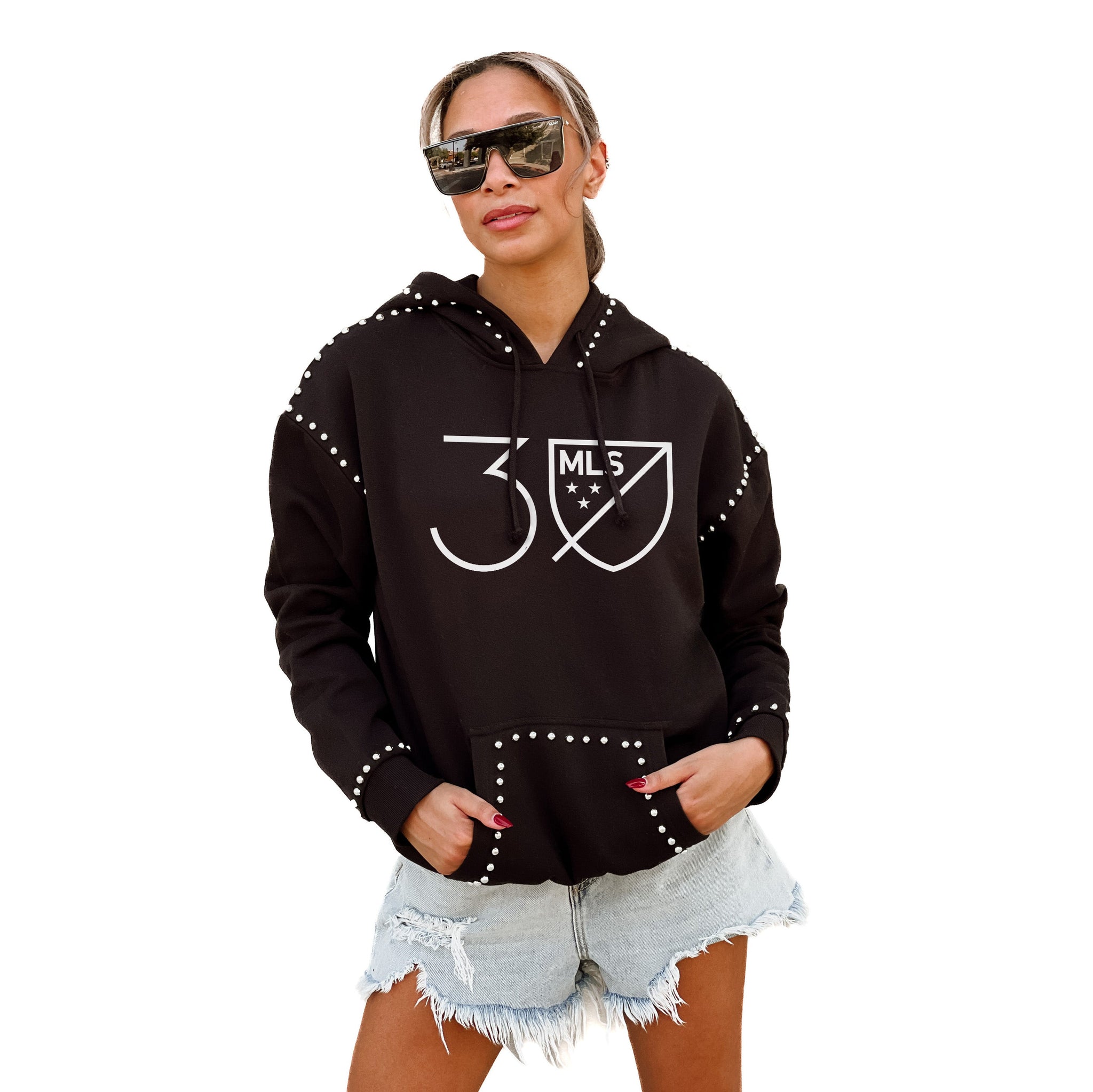 Celebrating Major League Soccer's 30th anniversary just got easier with our studded detail fleece front pocket hoodie. This studded detail hoodie, featuring ribbed cuffs and waistband, long sleeves, and front pouch pocket is a versatile addition to any wardrobe.