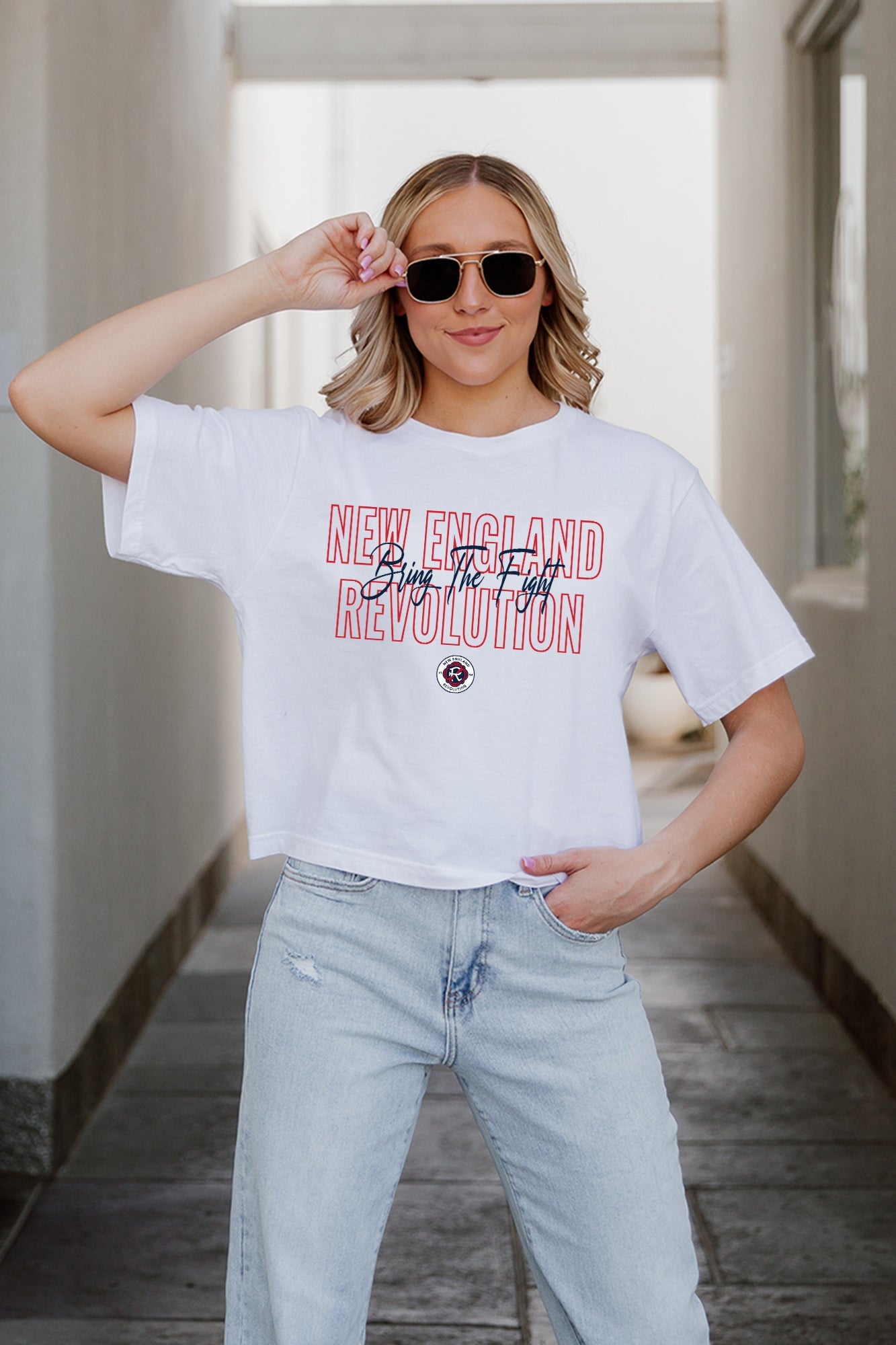 Every day is game day with our New England Revolution midi-length, boxy fit cropped tee with drop shoulder sleeves. Perfect for game day excitement or casual outings, this versatile tee is a must-have addition to your wardrobe.