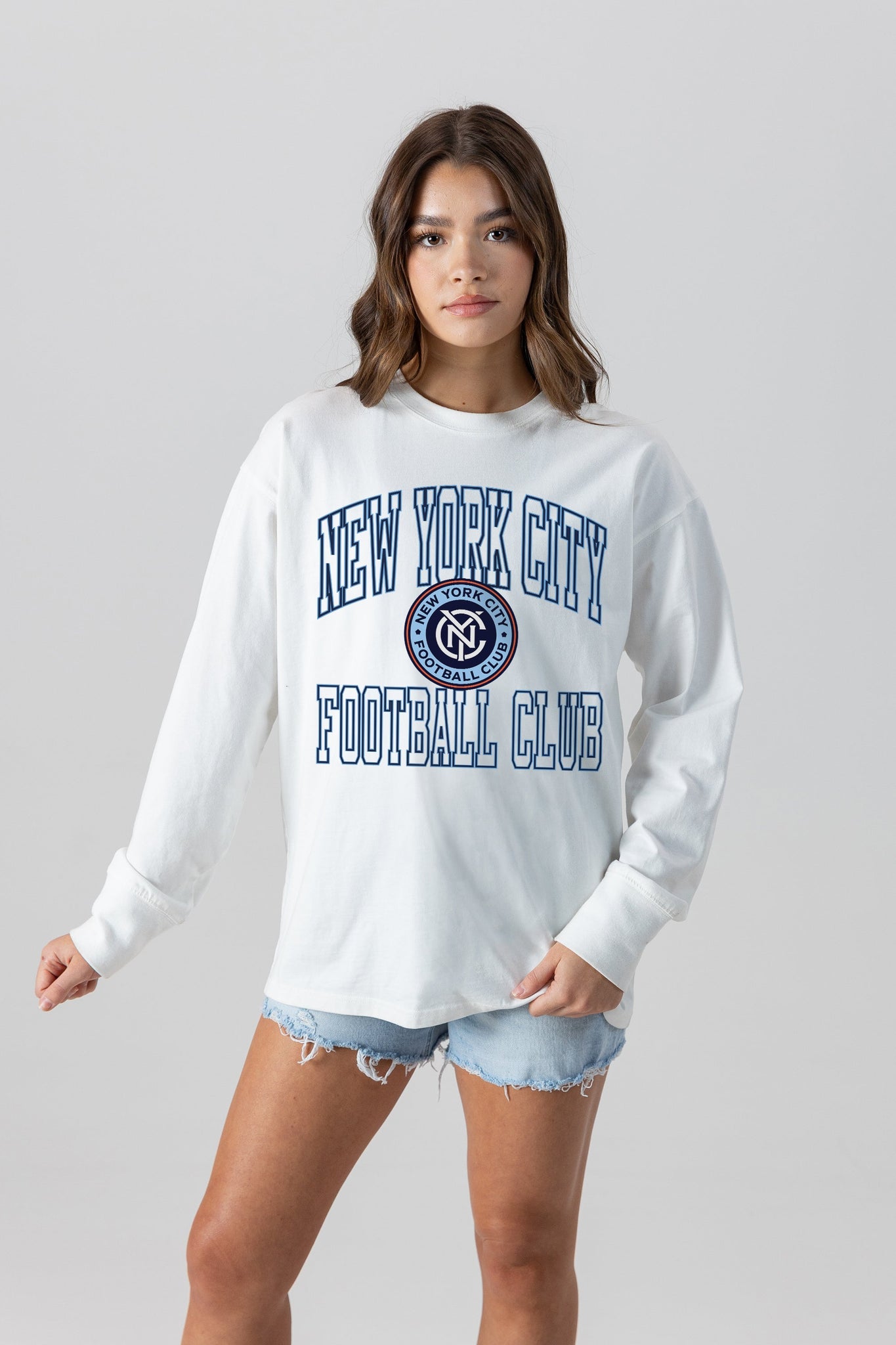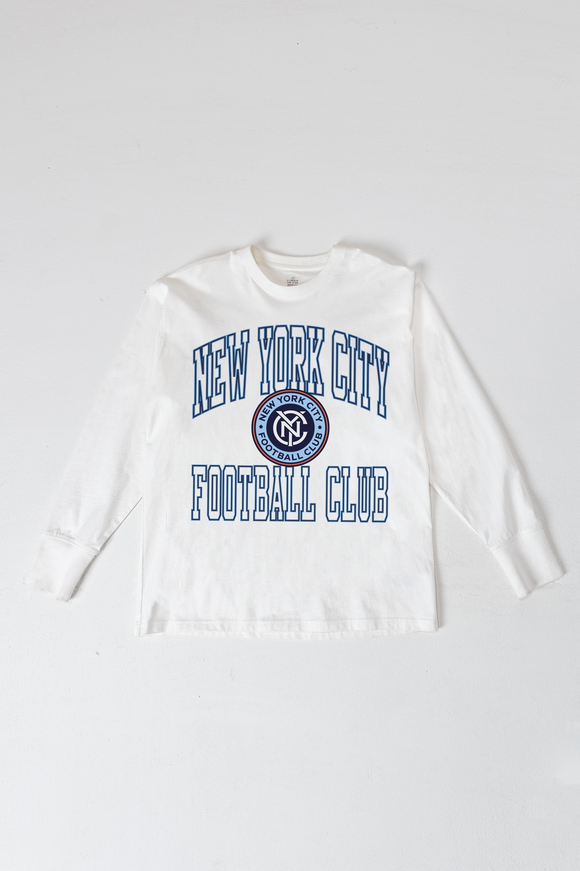Bring the energy of the game to your wardrobe with our New York City Fc oversized long sleeve tee with ribbed neckline and cuffs. Showing off your New York City Fc spirit will be a breeze.