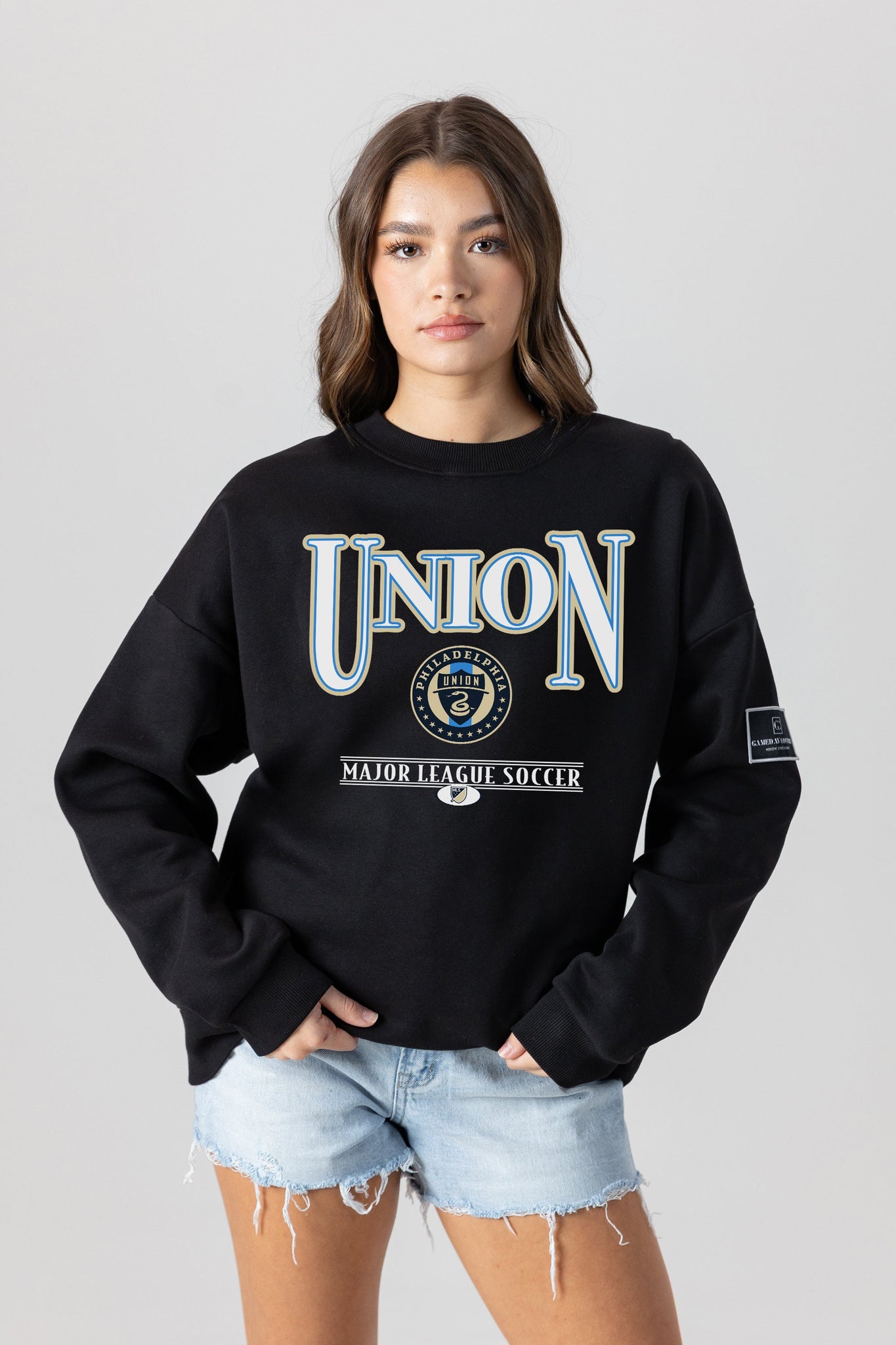 Get ready to cheer on your Philadelphia Union with our black label premium fleece drop-shoulder crewneck with ribbed knit neckline, cuffs, and waistband. From the game to the everyday, this is your go-to choice.