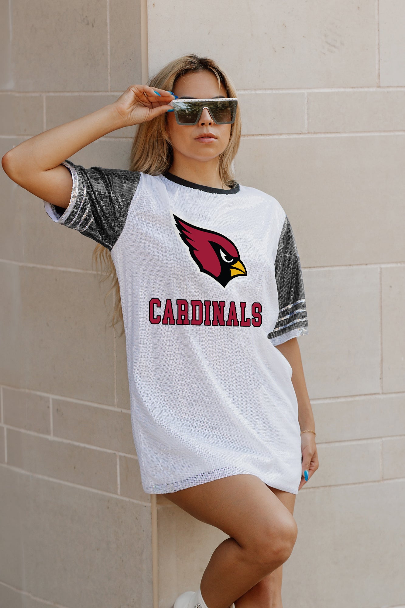 Elevate your game day look with our Arizona Cardinals full sequin jersey tunic dress. Designed with sports striping details on the sleeves and a lightweight garment lining, it ensures both style and comfort. Whether you're cheering from the stands or watching from home, rock your favorite school or team in standout fashion.