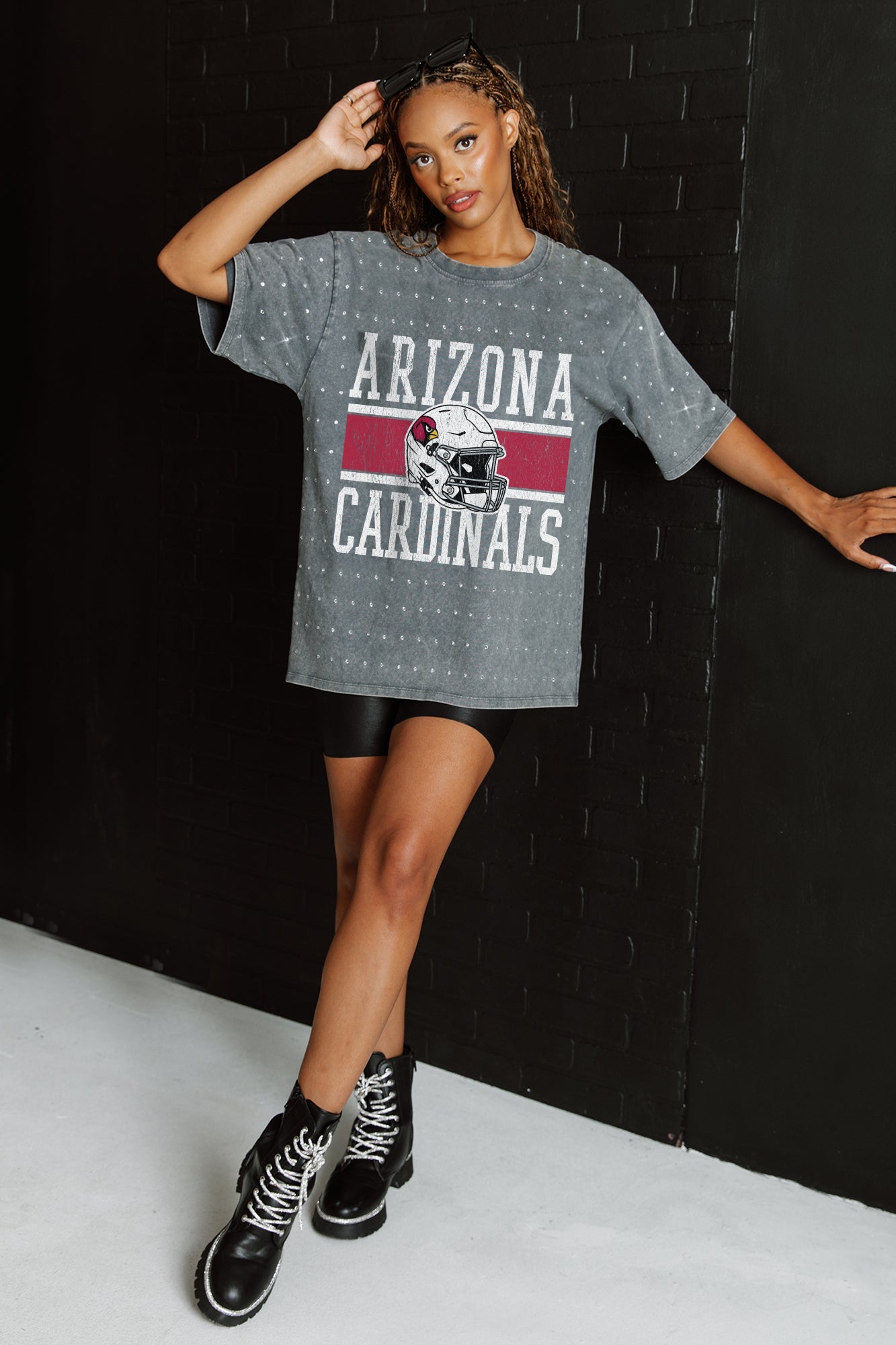 Make a statement in any crowd with our Arizona Cardinals oversized fit, all-over mini rhinestone short sleeve tee featuring a ribbed neckline. Embrace the sparkle while staying comfortable—perfect for every dedicated fan.