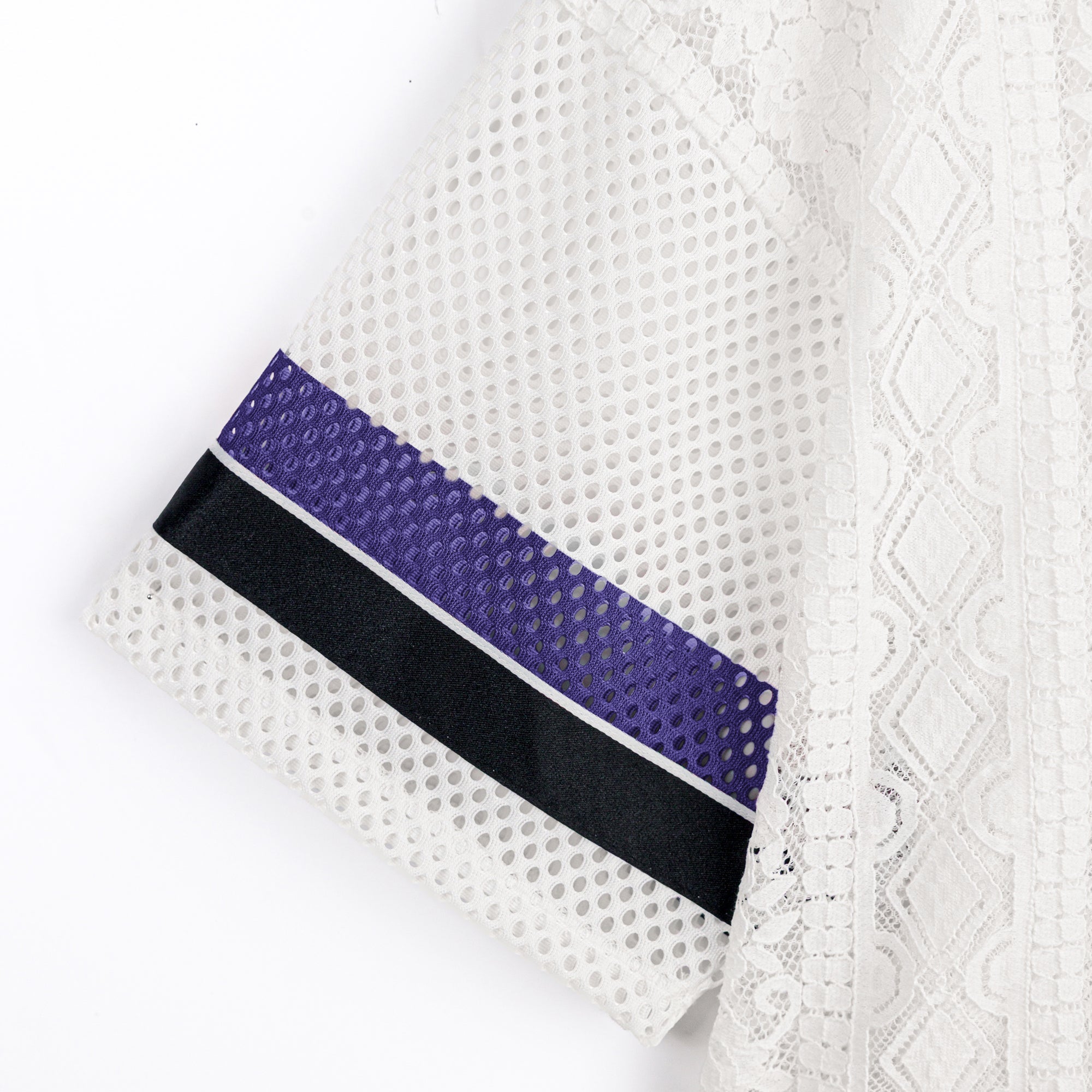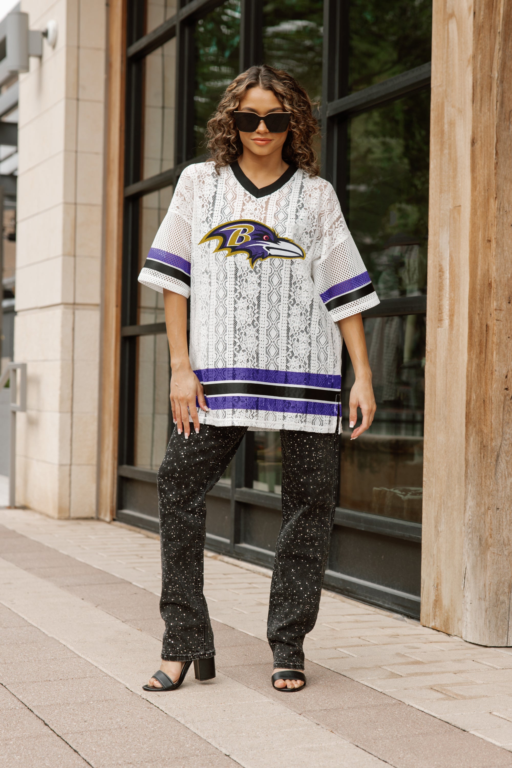 Bold, breathable, and completely unexpected, this lace fashion top is a total scene-stealer. Featuring a full lace body, satin and embroidered team graphics, and printed sport stripes, it’s a glam-meets-game-day statement piece made to rep Baltimore Ravens your way.