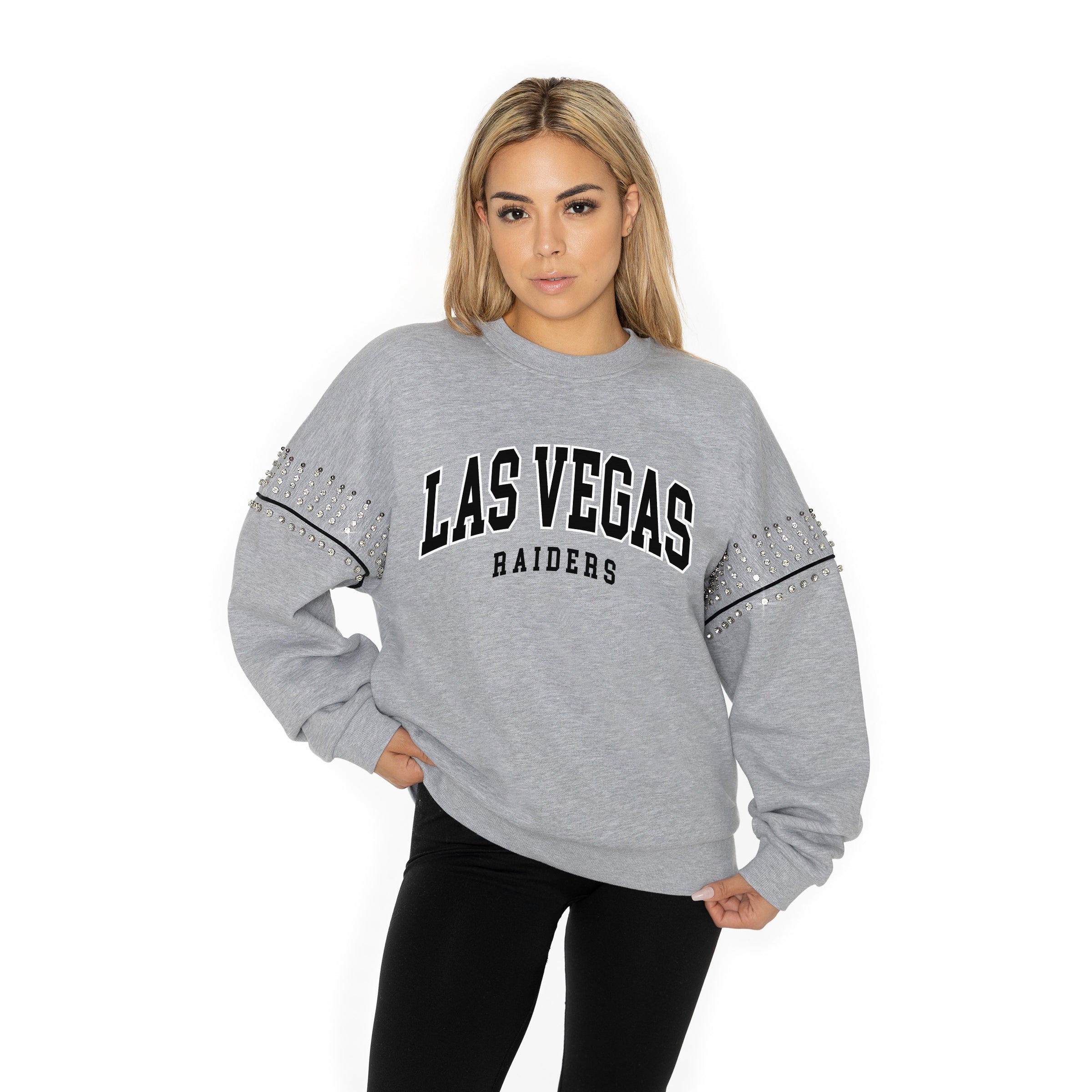 Shine in style with our Las Vegas Raiders oversized long sleeve crewneck fleece pullover, adorned with sparkling jewel shoulder embellishments. Designed with a relaxed drop shoulder silhouette and enhanced by dazzling inset rhinestones and hematite beads, this pullover promises to make a bold statement.
