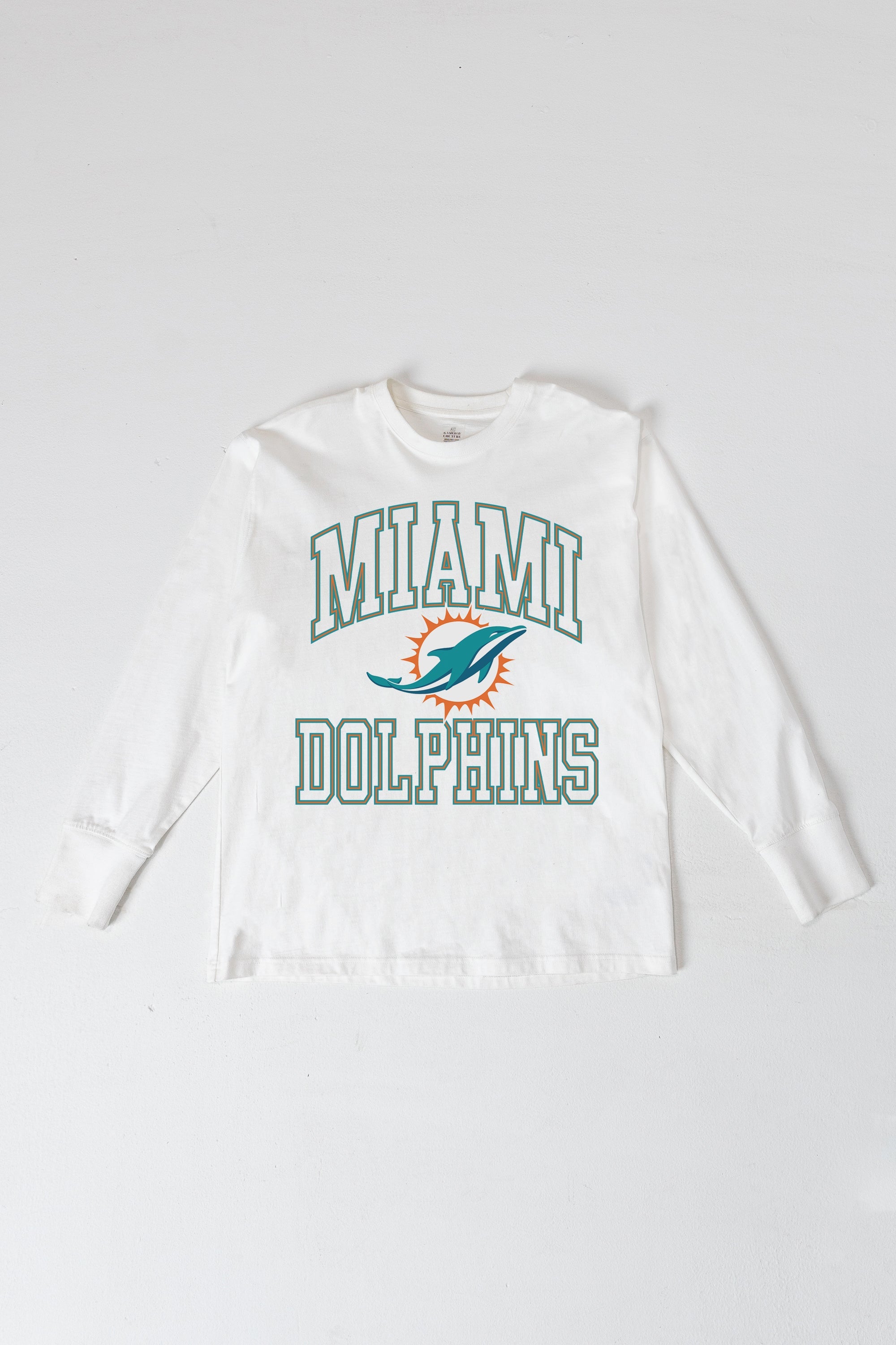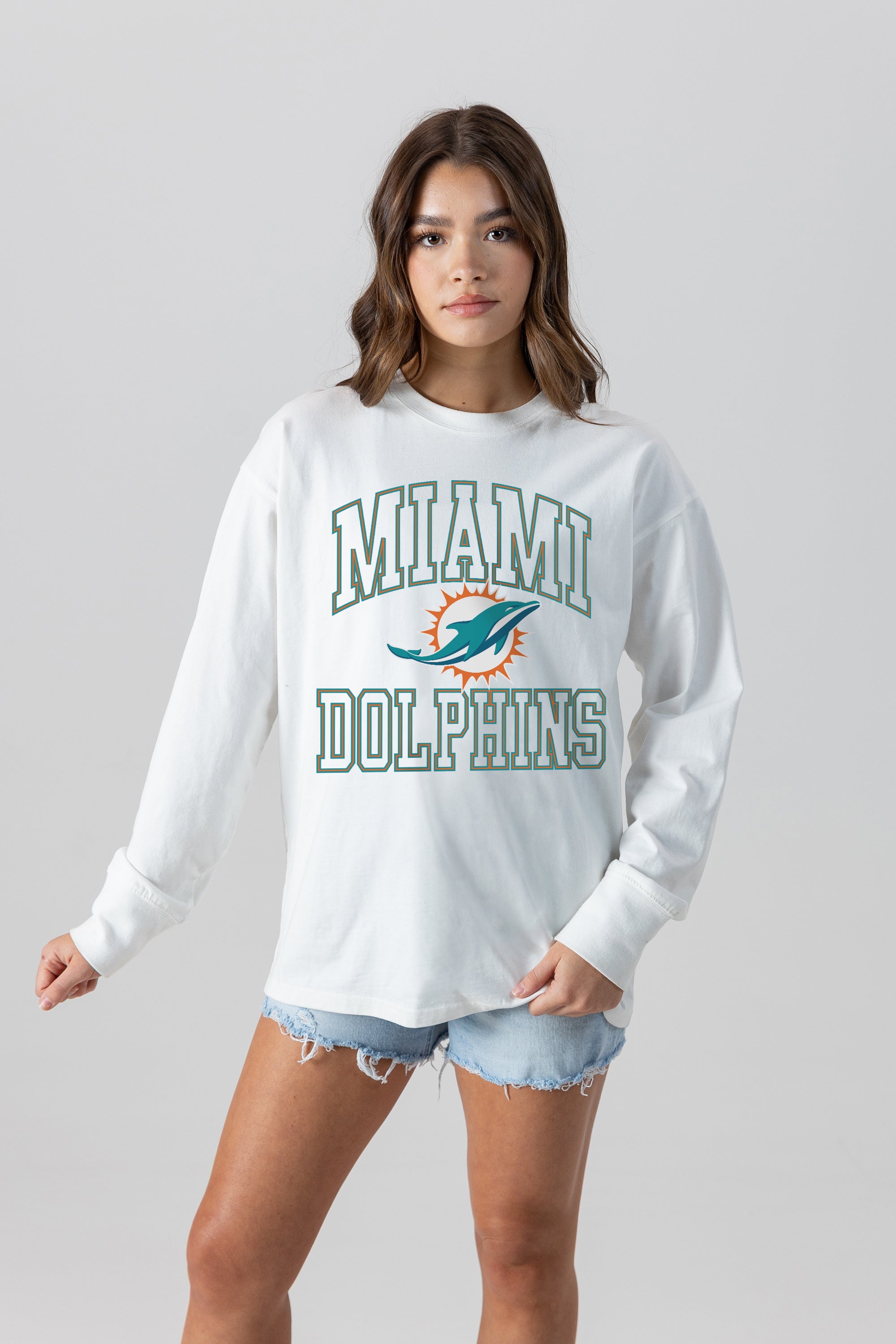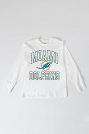 Bring the energy of the game to your wardrobe with our Miami Dolphins oversized long sleeve tee with ribbed neckline and cuffs. Showing off your Miami Dolphins spirit will be a breeze.