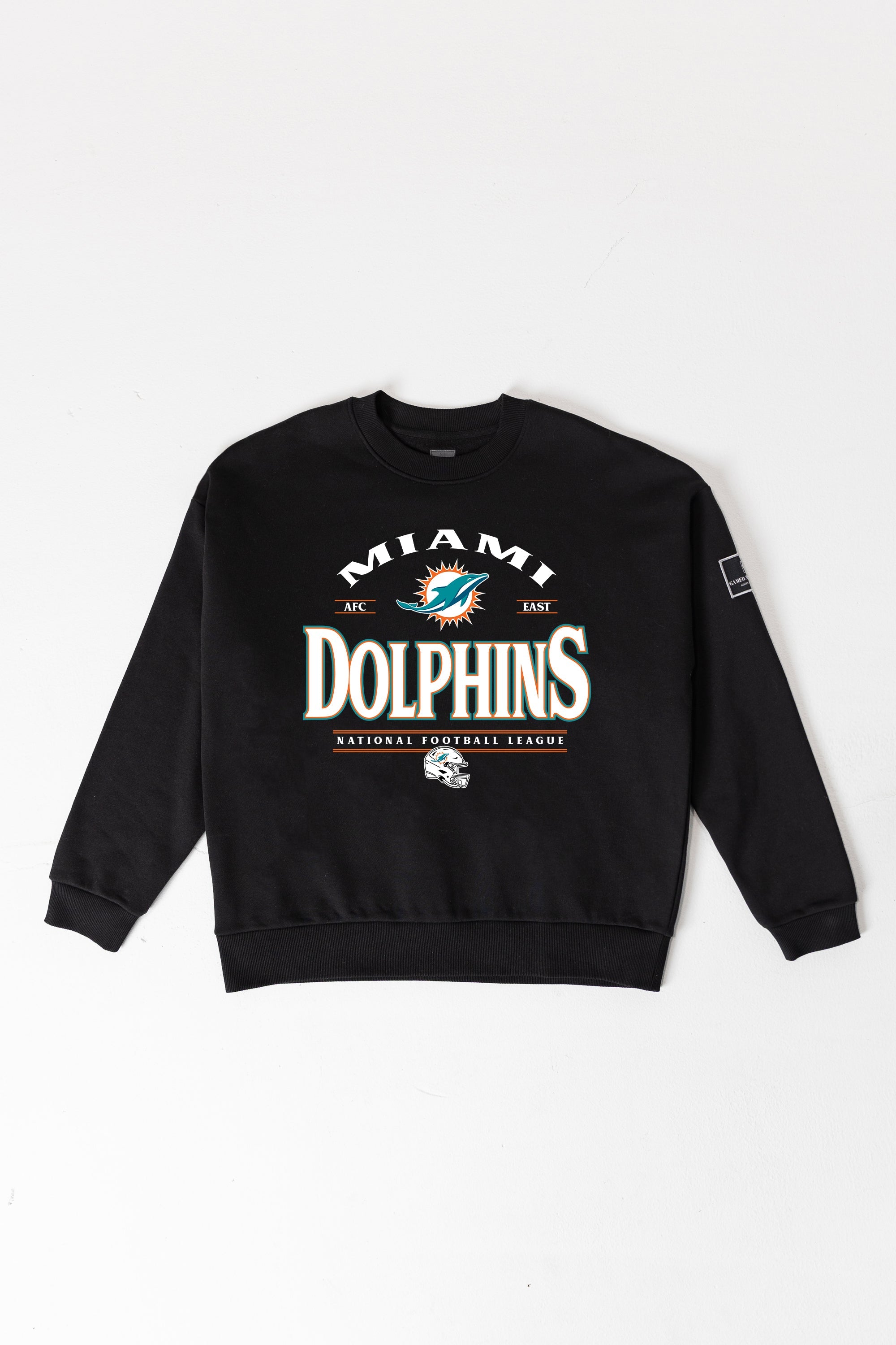 Get ready to cheer on your Miami Dolphins with our black label premium fleece drop-shoulder crewneck with ribbed knit neckline, cuffs, and waistband. From the game to the everyday, this is your go-to choice.