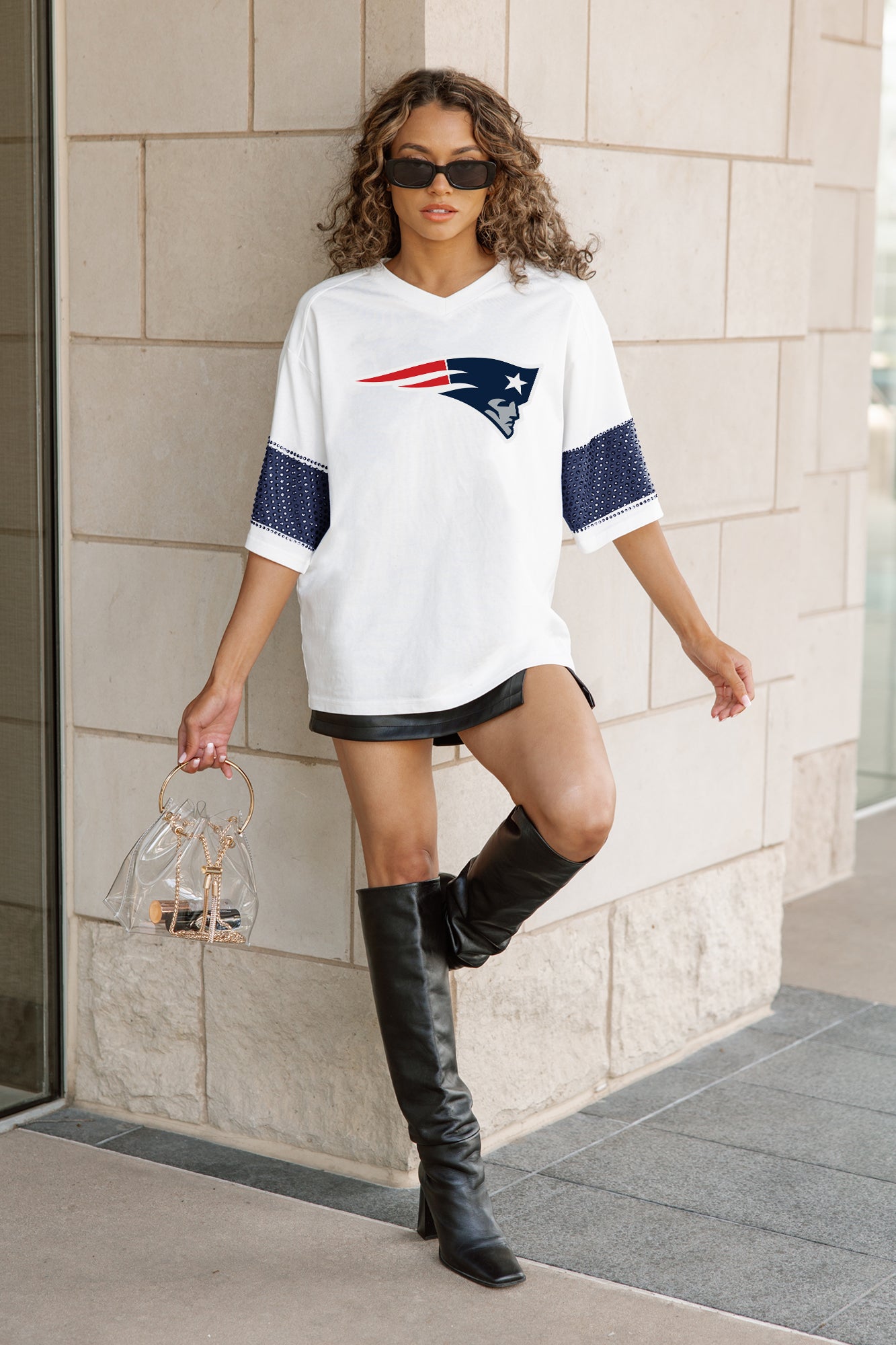 Level up your gameday lineup with our game day varsity Tee. Featuring rhinestone stripe detailing across the sleeves, a flattering V-neck, and a relaxed fit, this tee is made from premium cotton for all-day comfort. With full-color New England Patriots graphics and just the right amount of sparkle, it's your new favorite way to rep your team with a little extra shine.