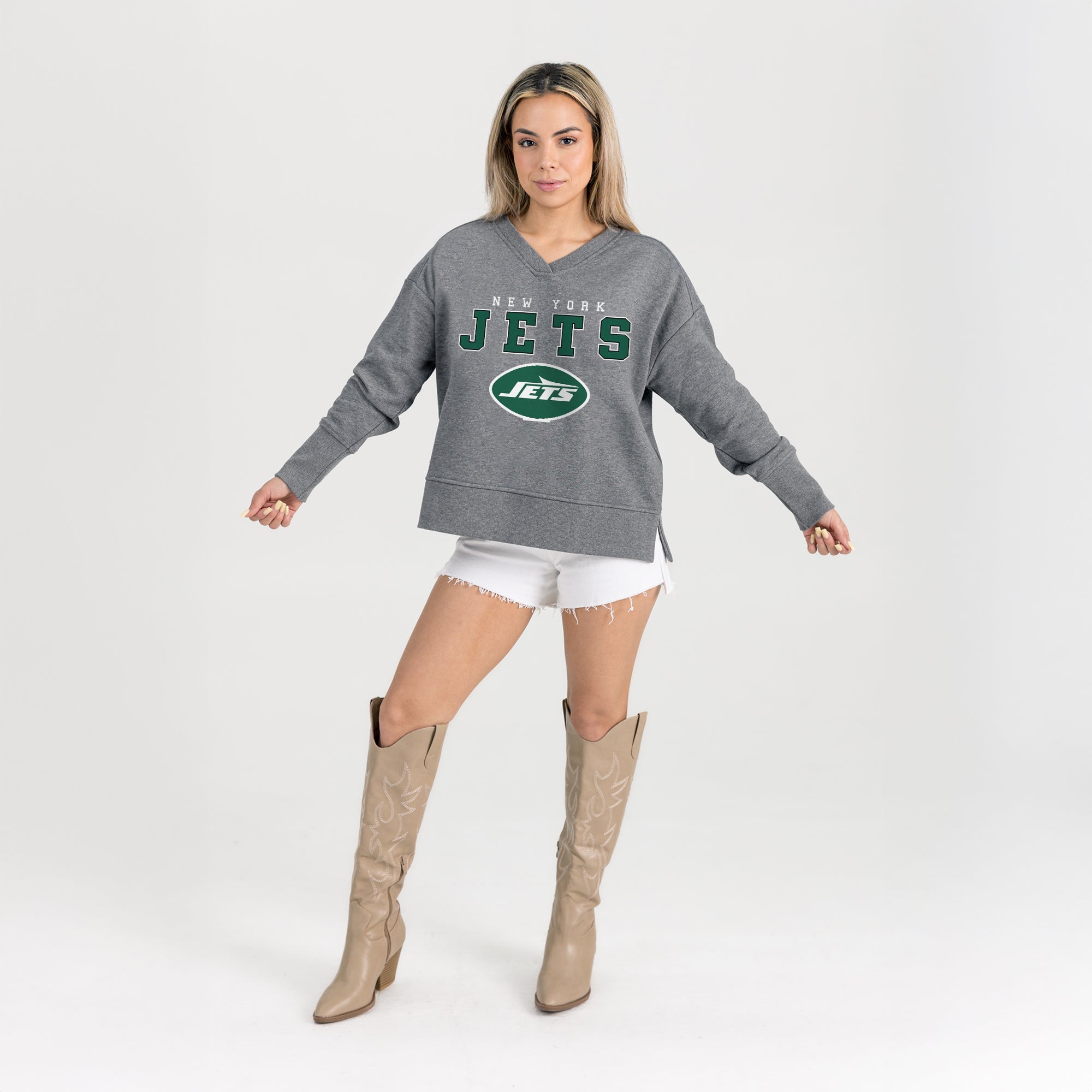 Made for movement and made to rep—this French terry pullover brings everyday ease with a wide bottom hem and drop shoulders for an elevated, roomy fit. Crafted in ultra-soft French terry and accented with standout New York Jets graphics, it’s the perfect layer to throw on and go, from campus to the couch.
