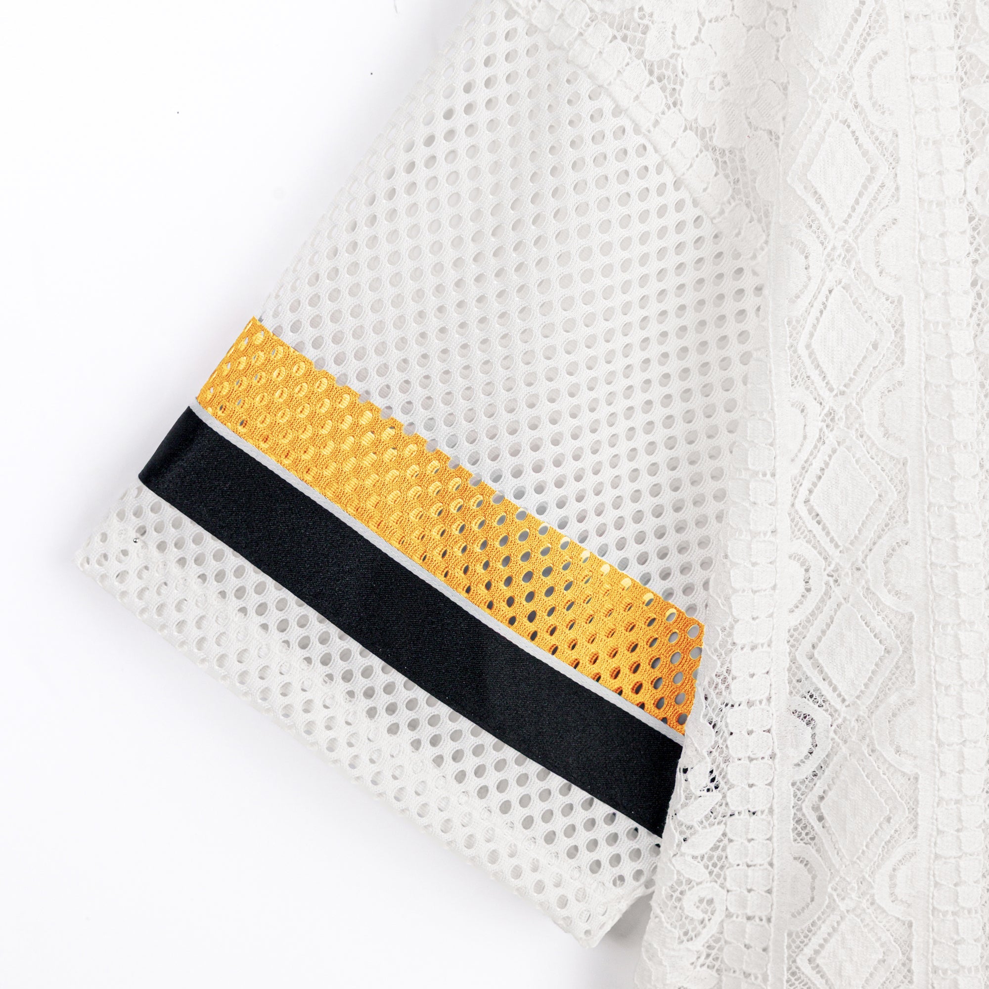 Bold, breathable, and completely unexpected, this lace fashion top is a total scene-stealer. Featuring a full lace body, satin and embroidered team graphics, and printed sport stripes, it’s a glam-meets-game-day statement piece made to rep Pittsburgh Steelers your way.