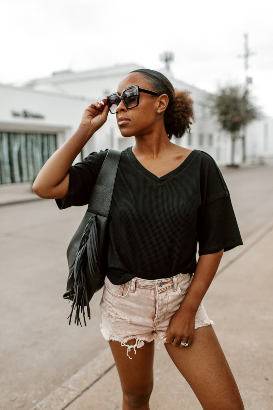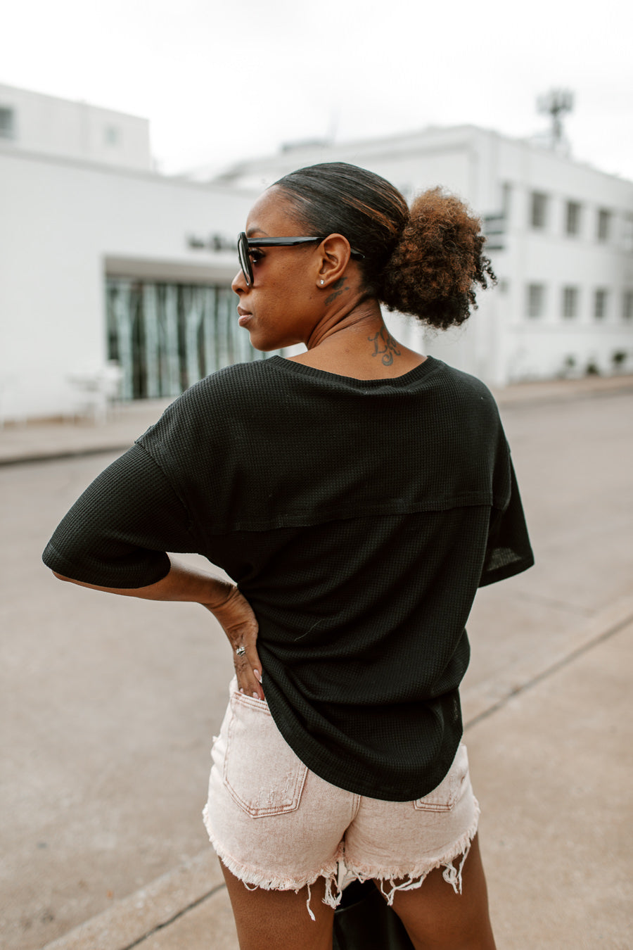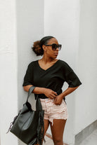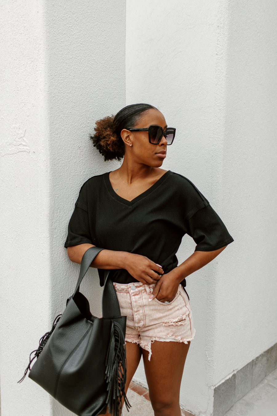 Warm weather ‘fits made easy in the "Vance" Cotton Relaxed V-Neck Top in a crinkled textured knit tee that pairs fab with the "Leyton" mauve acid wash jean shorts.