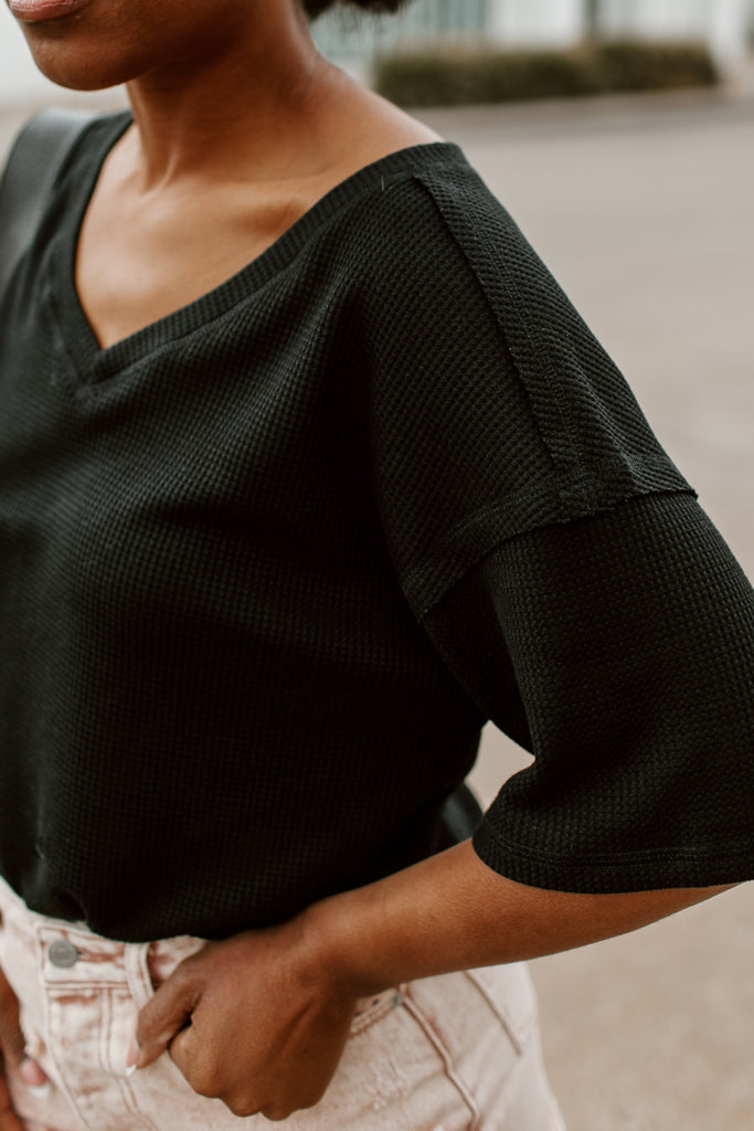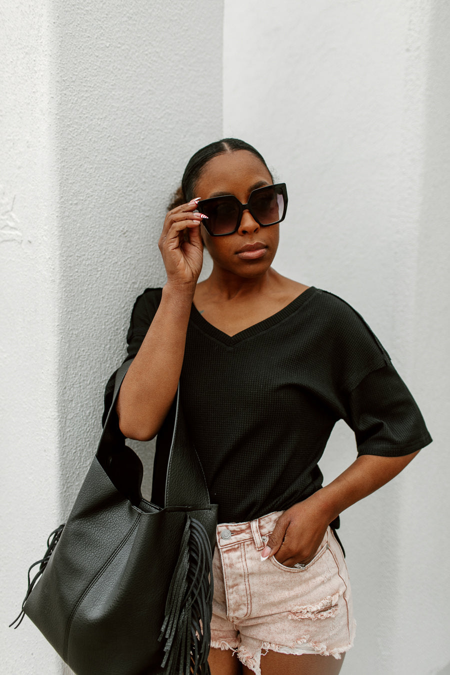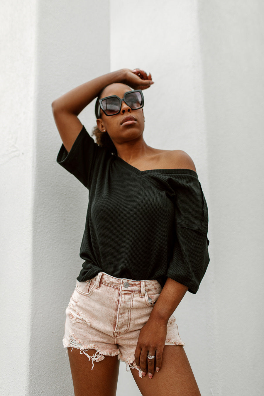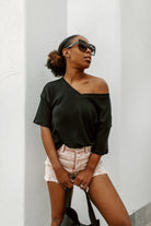 Warm weather ‘fits made easy in the "Vance" Cotton Relaxed V-Neck Top in a crinkled textured knit tee that pairs fab with the "Leyton" mauve acid wash jean shorts.